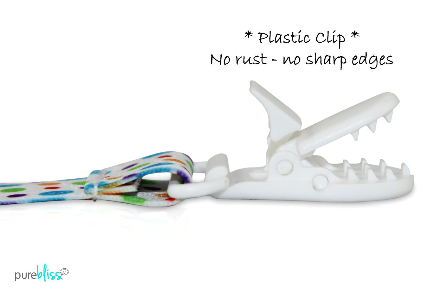 • Plastic clip won’t rust and has no sharp edges - so no owies and no holes in clothing.